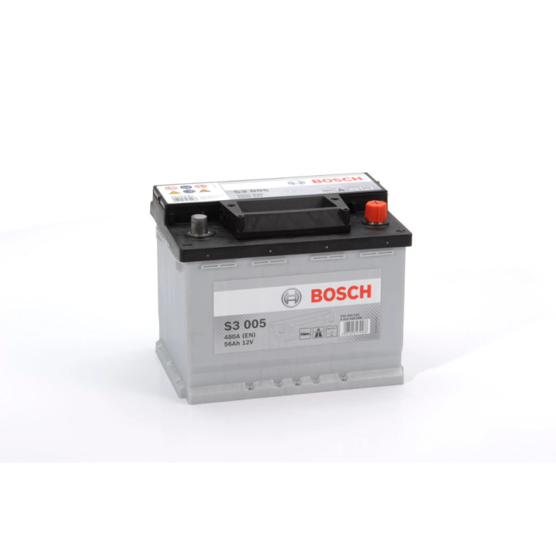 The Bosch S3 12V 56 Ah 480A R+ (0 092 S30 050) battery is designed for passenger cars. The model offers a capacity of 56 Ah and a cranking current of 480 A according to the EN standard. Right-positive polarity and B03 mounting provide convenient installation. Dimensions 242 x 175 x 190 mm and weight 13.70 kg fit typical engine bays of many vehicles.