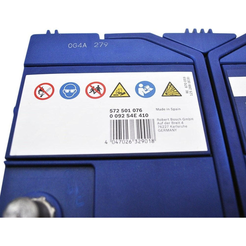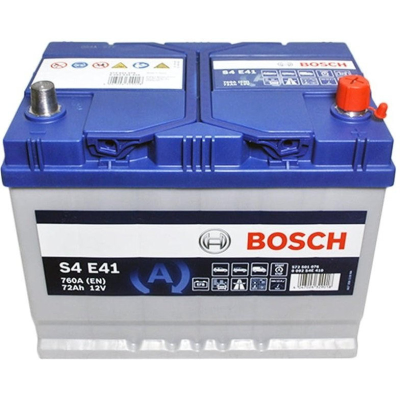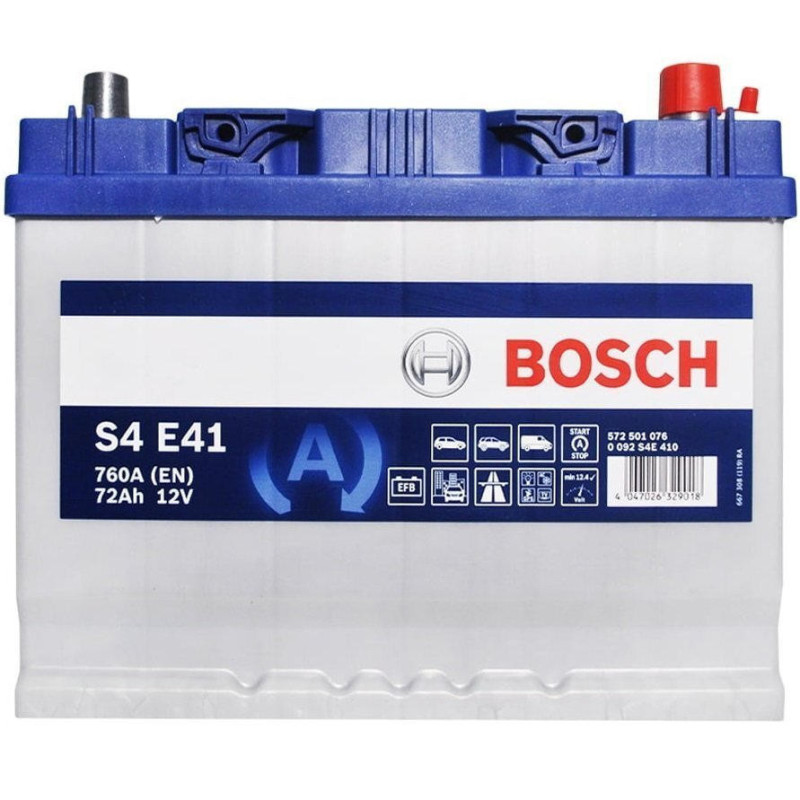The Bosch S4 12 V 72 Ah 760 A R+ (0 092 S4E 410) battery is designed for passenger cars with start-stop system. The model is built using EFB technology and delivers 760 A starting current at 72 Ah capacity. It features right positive polarity and B00 mounting without bottom fixation. Battery dimensions are 260 x 173 x 225 mm.