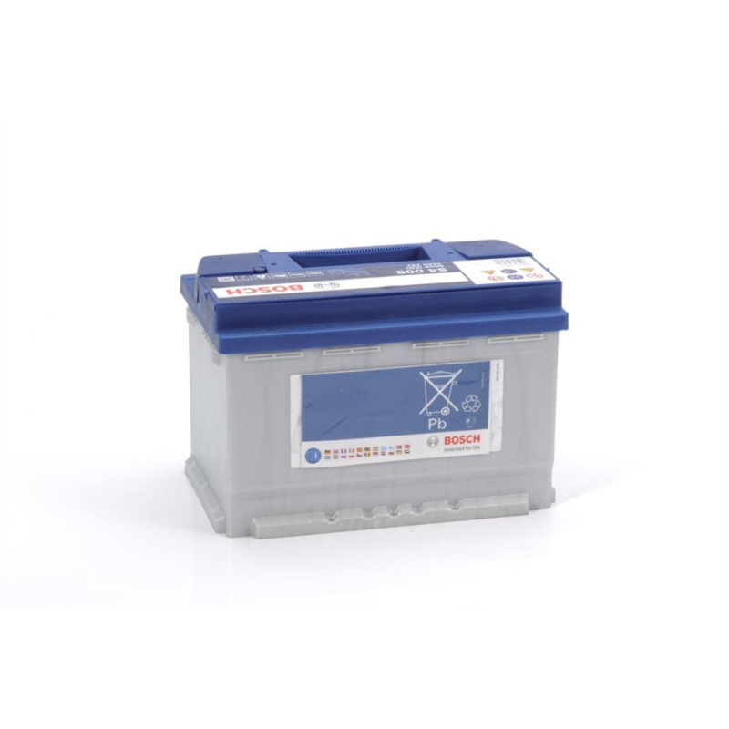 The Bosch S4 12 V 74 Ah 680 A L+ (0 092 S40 090) battery is designed for passenger cars with a standard electrical system. The model features left positive polarity and B03 mounting around the perimeter. The EN starting current is 680 A at a capacity of 74 Ah. Battery dimensions are 278 x 175 x 190 mm, filled weight is 17.90 kg.