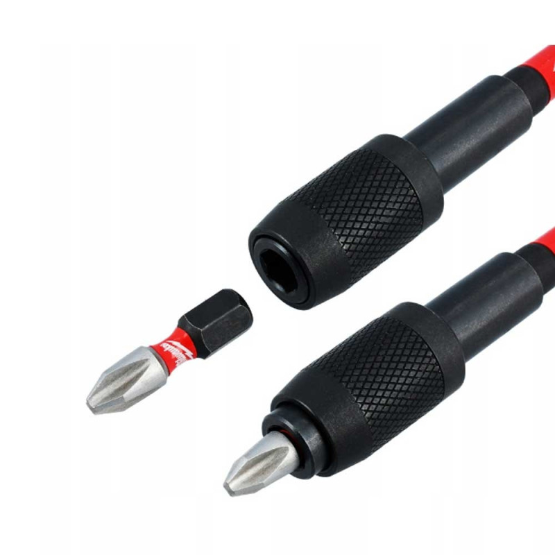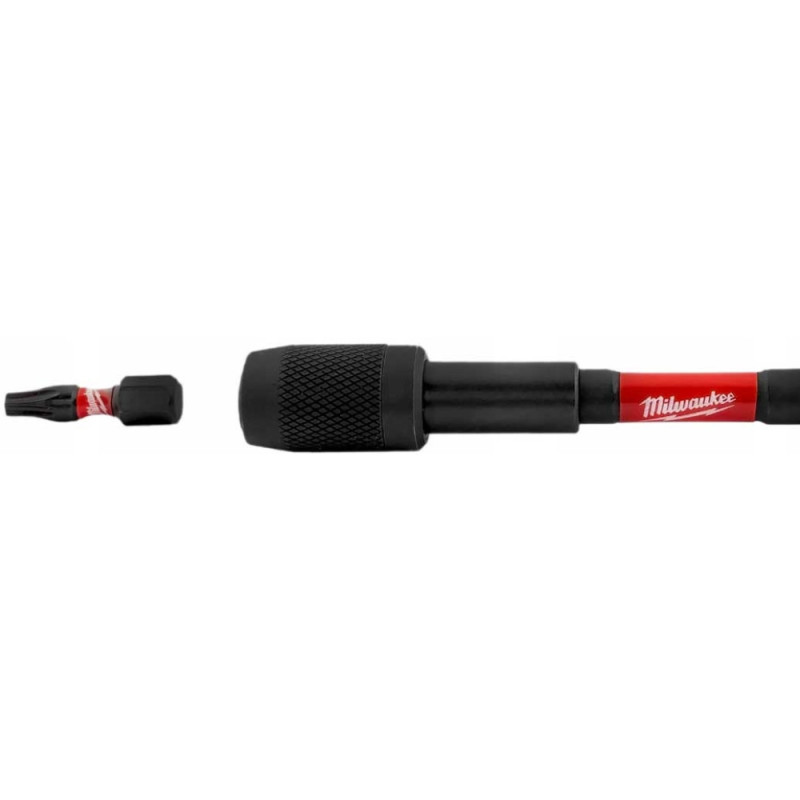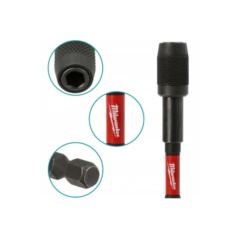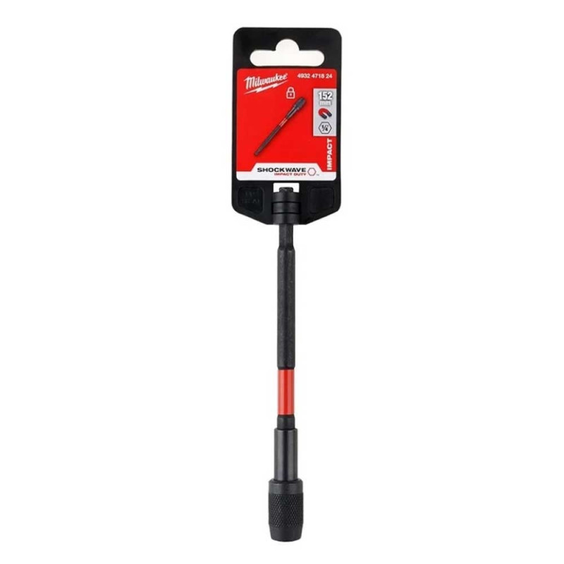 The Milwaukee SHOCKWAVE 1/4" Hex 152 mm magnetic bit holder features dual magnets and an Auto-Locking mechanism for secure bit retention. The long impact-resistant design provides access to recessed fasteners and compatibility with impact tools.