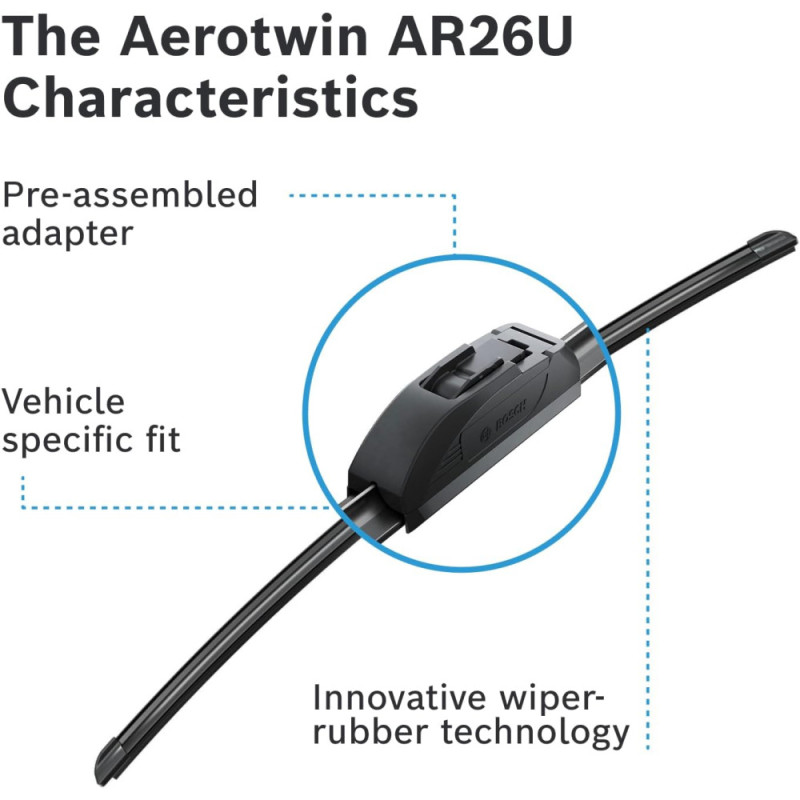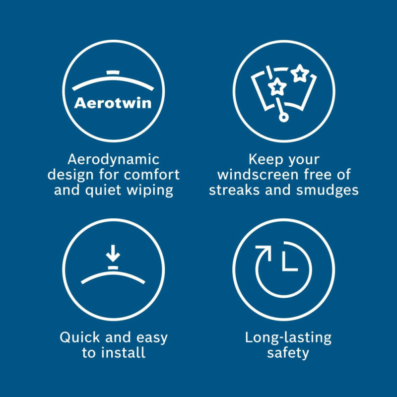The Bosch Aerotwin frameless wiper has a length of 650 mm and is designed for the windshield. The frameless construction provides even blade pressure across the entire surface. The product belongs to the RETRO AEROTWIN series. This shape adapts well to curved glass and reduces noise during movement.