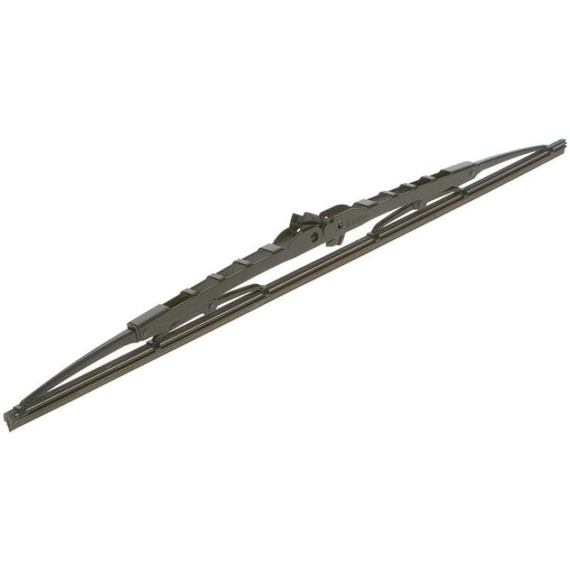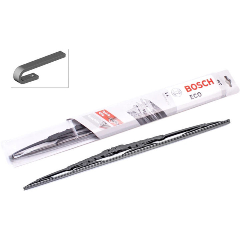 The BOSCH Eco framed wiper has a length of 480 mm and is designed for cleaning the windshield. The framed construction provides reliable and even blade pressure against the surface. The product belongs to the ClassicWiper series. Hook attachment allows easy installation on compatible models.