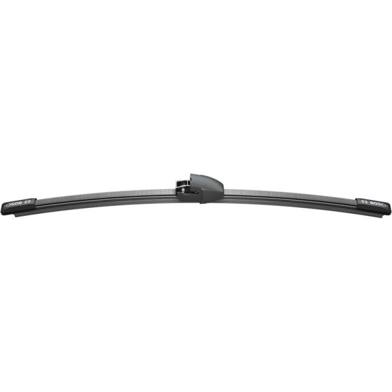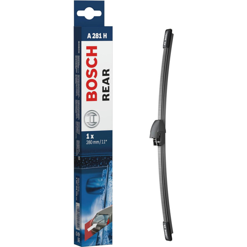 The BOSCH Twin frameless wiper has a length of 280 mm and is designed for the rear window of the vehicle. The frameless construction provides even pressure across the entire glass surface. The product belongs to the TWIN series. This shape reduces air resistance during movement.