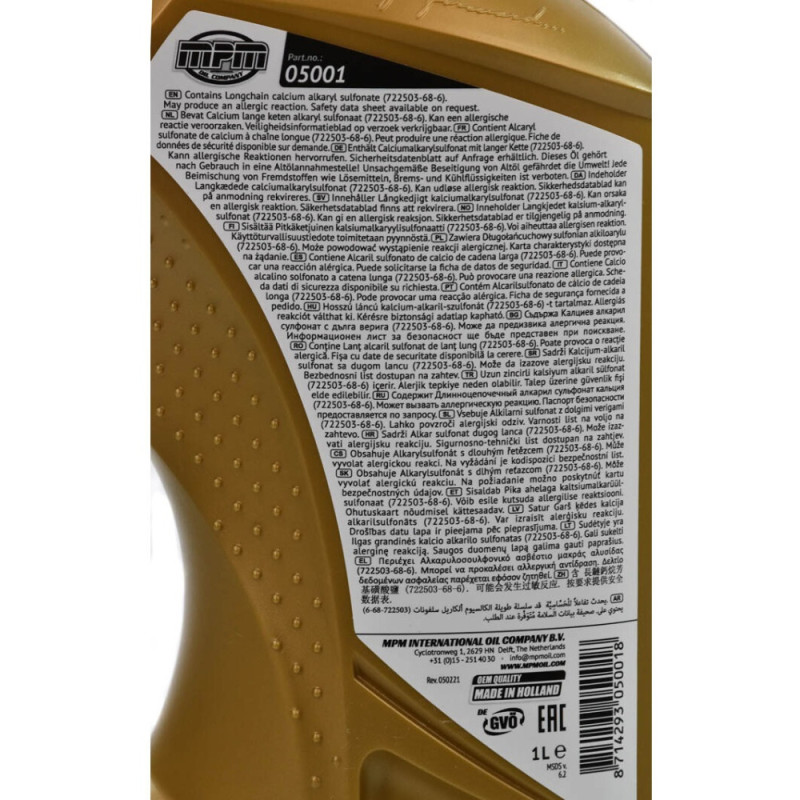 MPM Premium Synthetic 5W-40 is a fully synthetic engine oil designed for gasoline and diesel engines. It meets ACEA A3/B4 and API SN/CF specifications. Provides stable viscosity across varying temperatures. Compatible with requirements from VW, BMW, Mercedes-Benz, Porsche, and others. The 1-liter format is suitable for top-up or maintenance use.
