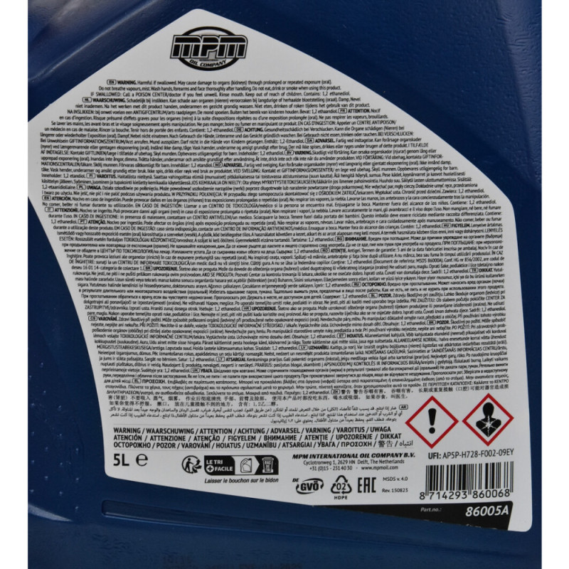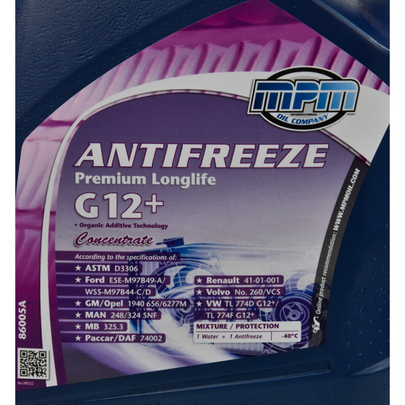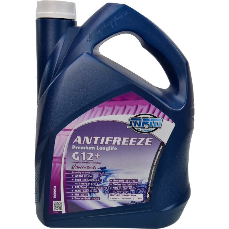 MPM Premium Longlife G-12+ antifreeze concentrate is a red coolant for engine cooling systems. The concentrated formula allows flexible mixing ratios. It provides freeze protection down to -80°C in concentrated form. A silicate-free technology helps reduce corrosion and deposits. It complies with a wide range of manufacturer standards.