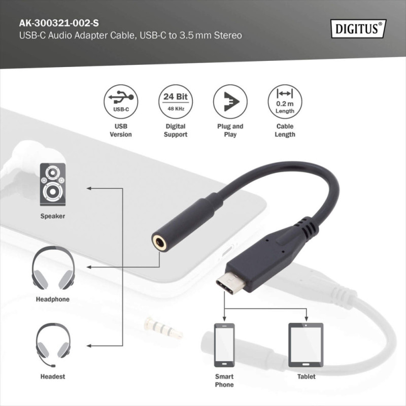 The DIGITUS USB-C to 3.5 mm audio adapter enables connection of headphones, headsets or speakers to USB-C devices. It supports digital audio up to 24-bit and 48 kHz for clear sound output. The reversible USB Type-C connector allows easy plug-in from either side. Double cable shielding helps maintain stable audio transmission. Its compact length makes it suitable for daily use.