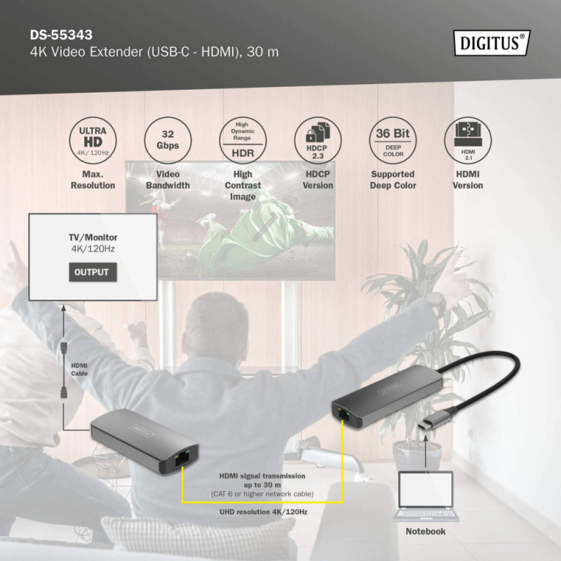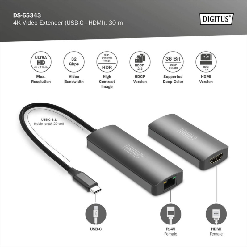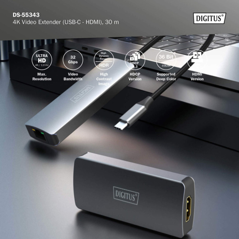 The DIGITUS DS-55343 set extends a USB-C to HDMI signal up to 30 m over a single CAT6 or higher cable. It supports 4K at 120 Hz with full 4:4:4 chroma and HDR. The transmitter draws power from the source device, while the receiver is powered via the included USB-C cable. The system provides 32 Gbps video bandwidth and HDCP 2.3 compliance.