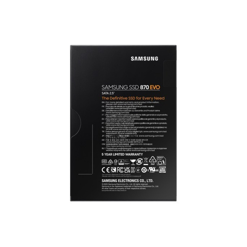 The Samsung 870 EVO 2.5" SSD combines high capacity with consistent performance. The SATA III interface ensures broad system compatibility. Read speeds up to 560 MB/s and write speeds up to 530 MB/s support efficient data handling. 3D NAND technology improves storage reliability. The 4800 TBW endurance rating targets long-term operation.