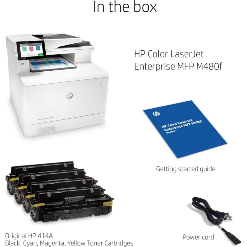 Original HP LaserJet Black Toner Cartridge (~2,400 page yield), Original HP LaserJet Cyan, Magenta, and Yellow Toner Cartridges (~2,100 pages each), Quick Start Guide, 1 power cable