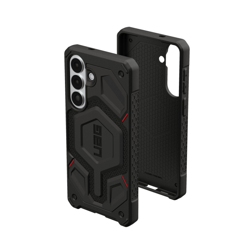 UAG Monarch Pro with Magnet case for Samsung Galaxy S26+ (Kevlar Black) is a 5-layer premium protection from Urban Armor Gear with built-in magnetic ring for MagSafe charging. Impact-absorbing composite construction with soft cushioned edges, Kevlar aramid fiber and reinforced metal hardware provides reliable drop and impact protection. Oversized buttons, precise cutouts for ports and cameras, no flash glare in photos and undistorted sound make the case extremely user-friendly.