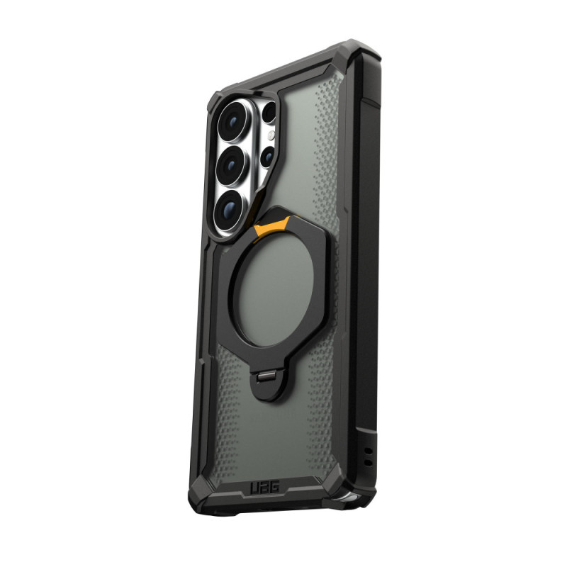 The UAG Plasma XTE 360 with Magnet case for Samsung Galaxy S26 Ultra combines shock-absorbing construction, an integrated magnetic module and a 360° rotating metal kickstand. The perforated honeycomb interior disperses impact energy effectively. A raised bezel helps protect the display when placed face down. The rotating stand provides adjustable viewing angles in both portrait and landscape modes.