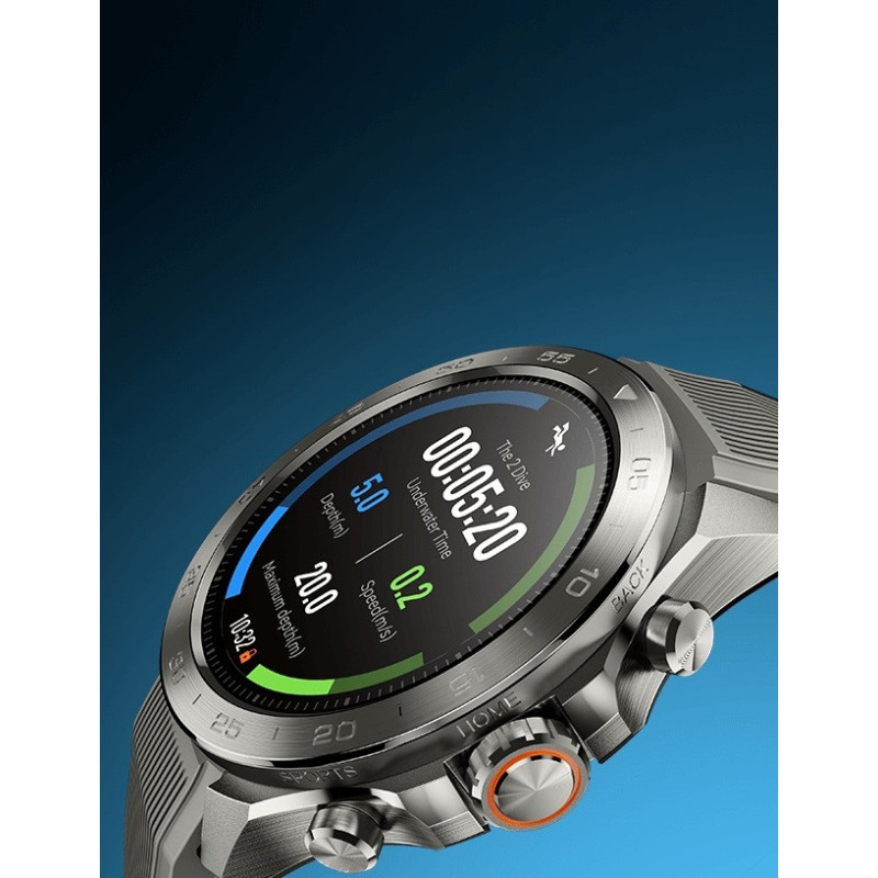 The Mibro GS Explorer S smartwatch features a titanium case paired with a silicone strap, weighing approximately 76 g for comfortable extended wear. Its 1.32" AMOLED display with 466×466 resolution and up to 1500 nits brightness delivers clear visuals in any lighting, including Always-On Display support. The device includes dual-band GPS, 10 ATM water resistance with freediving capabilities, over 150 sports modes, and up to 20 days of battery life in typical use.