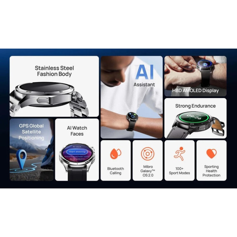 The Mibro GT smartwatch in a dark metal 46 mm case features a 1.43-inch AMOLED screen with 466x466 resolution and up to 600 nits brightness. Sensors continuously track heart rate, blood oxygen, and stress, with 5 ATM water resistance for aquatic use. GNSS navigation and over 100 sports modes are enhanced by AI features like voice assistant and watch face generation.
