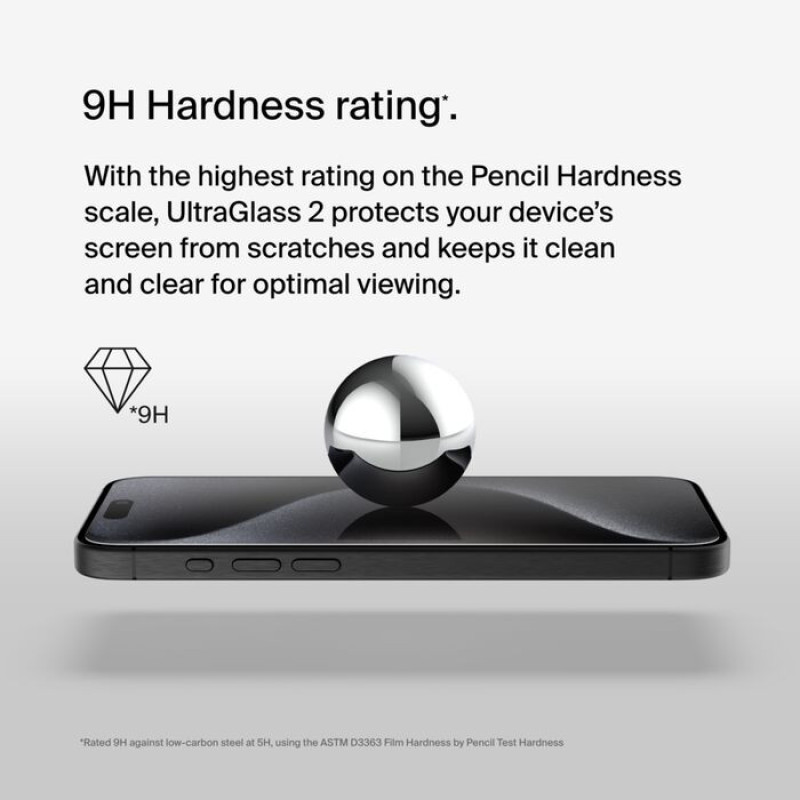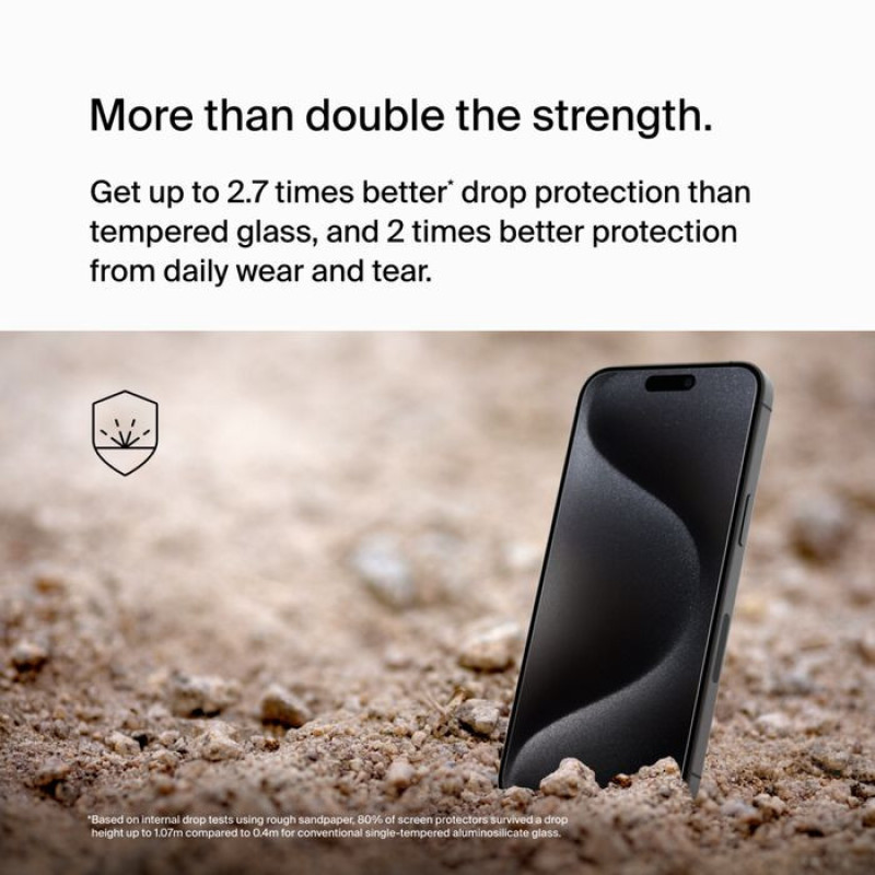 Belkin UltraGlass2 screen protector for iPhone 15 Pro Max offers enhanced durability in an ultra-thin design. It is up to 2.7 times stronger than standard tempered glass for improved protection. The 0.29 mm thickness preserves touch sensitivity and screen clarity. An antimicrobial coating helps keep the surface cleaner. The Easy Align tray ensures quick and precise installation.