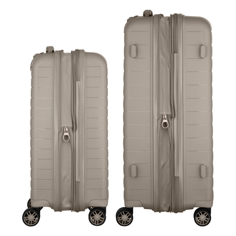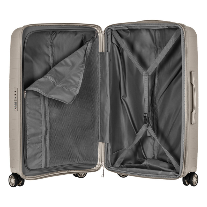 possibility of expansion (increase in volume), double wheels, dividers and adjustable packing straps inside