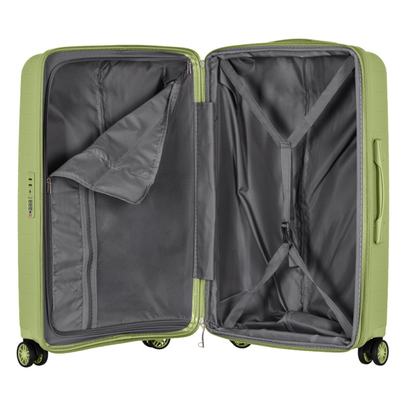 possibility of expansion (increase in volume), TSA lock, double wheels, dividers and adjustable packing straps inside