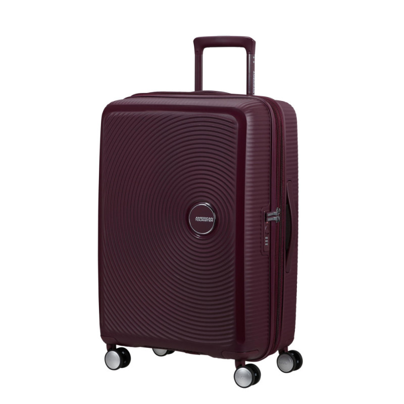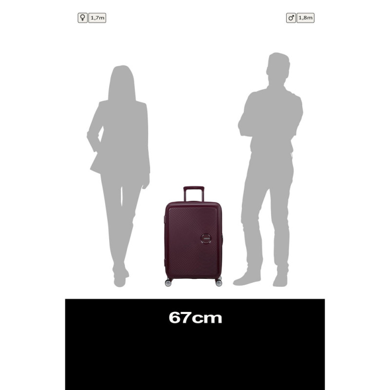 American Tourister Soundbox M is a medium-size hard-shell suitcase made of polypropylene. Suitable for multi-day trips and checked-in air travel. The expansion zipper increases capacity from 71.5 to 81 L. Four double spinner wheels and a telescopic handle support easy movement. The integrated TSA lock allows inspection without case damage.