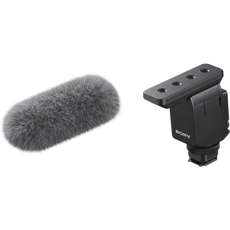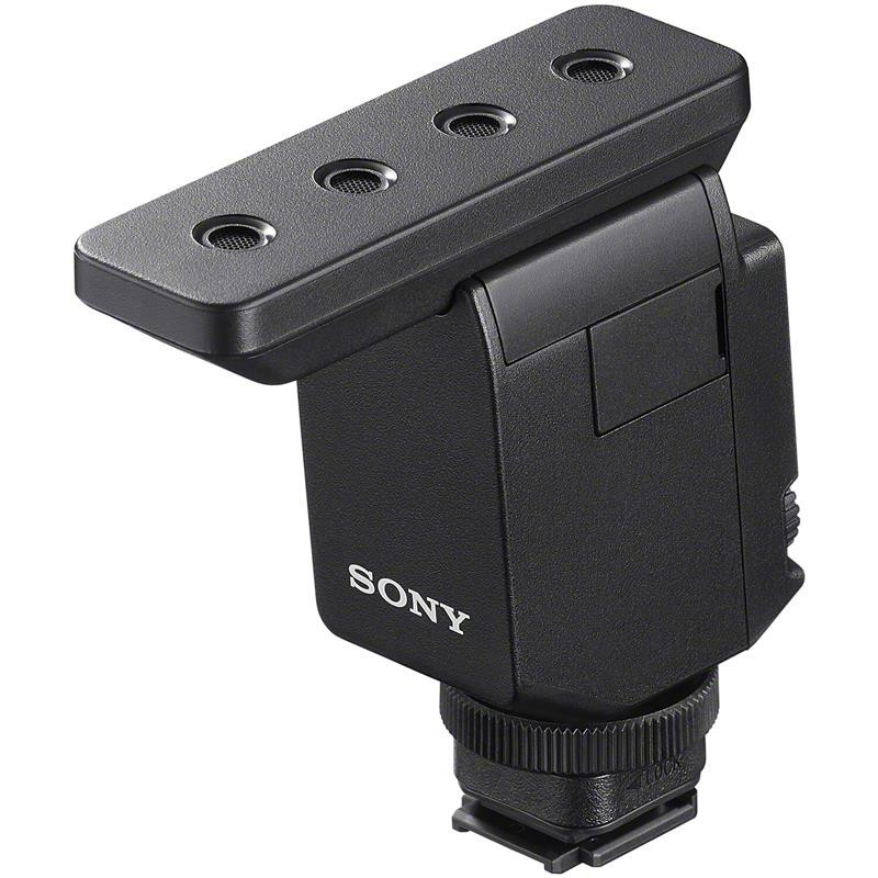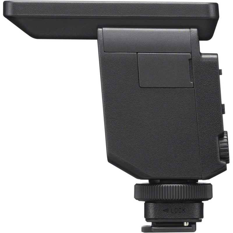 The Sony ECM-B10 microphone mounts on the camera for digital audio transmission with beamforming technology. Three directivity modes (super-, uni-, and omni-) capture voice or ambiance without noise. Compact 79.3 mm length with dust and moisture resistance eases outdoor shoots. Cable-free and battery-free, power comes from the camera's MI Shoe. This device optimizes recording for vlogs and podcasts.