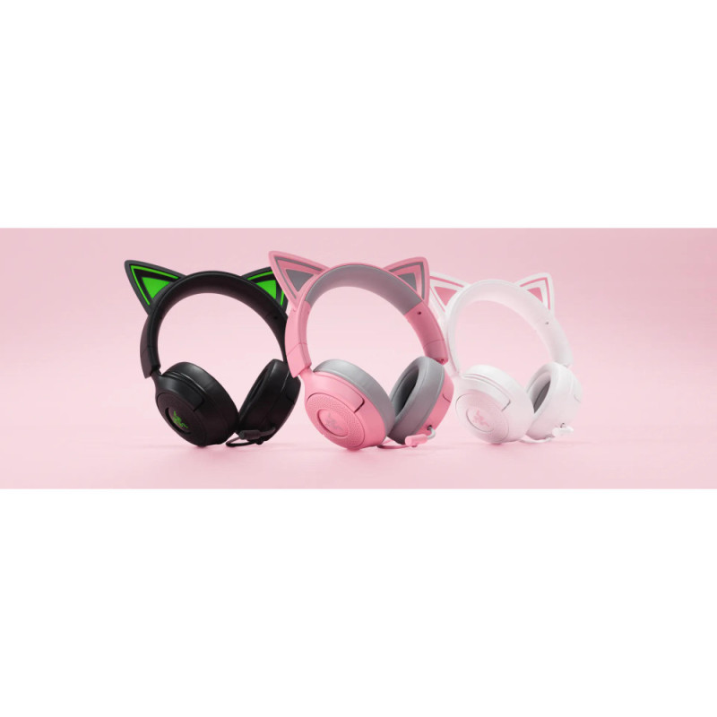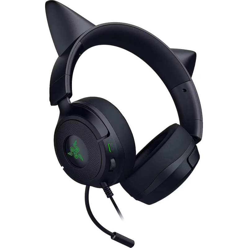 The Razer Kraken Kitty V3 X headset is a gaming model featuring signature cat ears, 3.5 mm mini-jack connection, and a 1.3 m cable. It is equipped with 40 mm drivers for rich sound and soft ear cushions for comfortable wear. The black design with pink accents makes it bright and recognizable. The headset is suitable for both gaming and everyday listening.