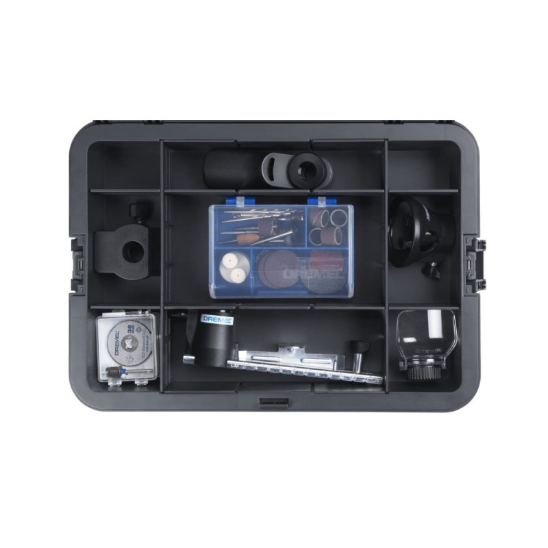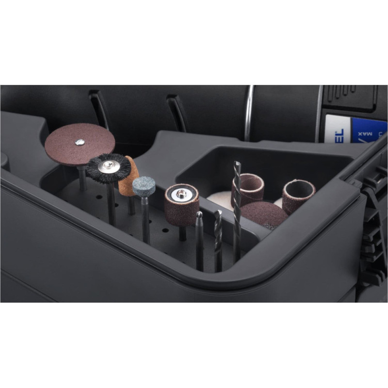 The Dremel 8240 5/65 Platinum+ Sanding and Engraving Machine is a cordless multi-tool designed for cutting, sanding, polishing, engraving, deburring, and sharpening. The model is powered by a 12 V battery and supports speed control in the range of 5,000–35,000 rpm. The design combines autonomy, precision control, and a wide range of operations. The package includes two batteries, a charger, 65 accessories, 5 attachments, and the Dremel Box storage system.