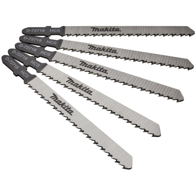 The Makita D-72718 jigsaw blade is designed for cutting wood. It is made of high carbon steel (HCS) for reliable performance on soft materials. The blade length is 100 mm. A 9 TPI tooth pitch supports smooth cutting. The pack contains 5 blades.