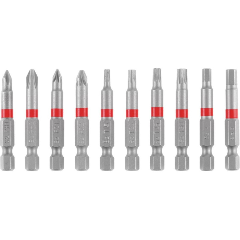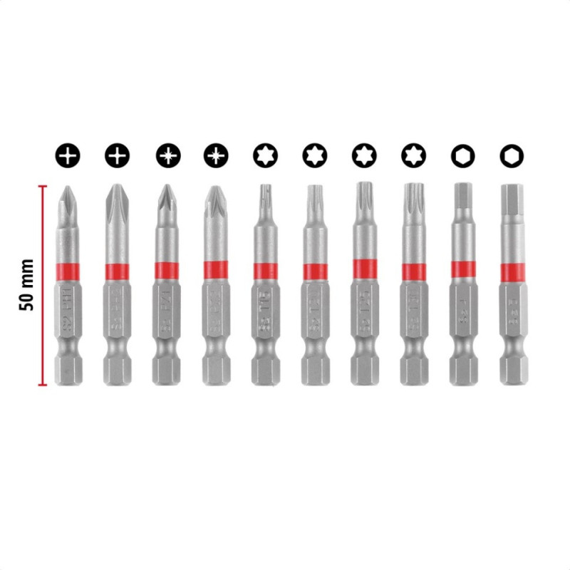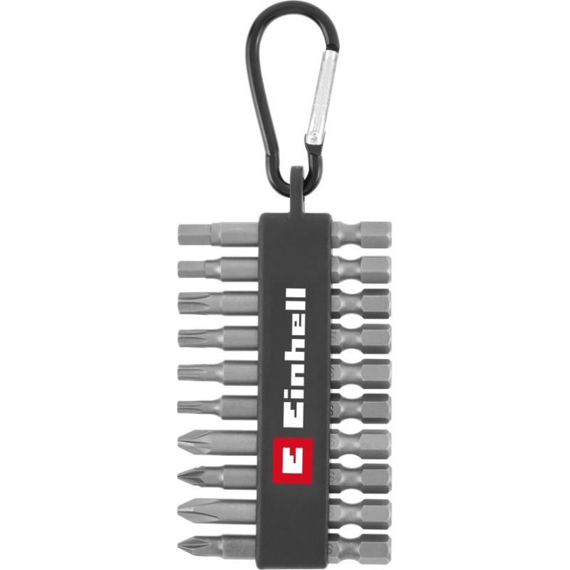 Einhell 10-pc 50 mm impact bit set: PH1, PH2, PZ1, PZ2, T15, T20, T25, T30, H4, H5. Made of sandblasted S2 steel for superior impact durability. Clear profile marking. Mounted on a compact strip with strong carabiner clip — easily attaches to belt, bag or tool pouch. Perfect for tight spaces, overhead work, automotive and on-site tasks.