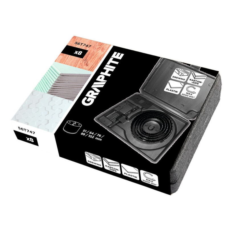 The GRAPHITE wood hole saw set is designed for cutting large-diameter holes in wood and wood-based materials. The set includes popular hole saw sizes, a drill adapter and a storage case. The set is an optimal solution for installation, woodworking and renovation tasks.