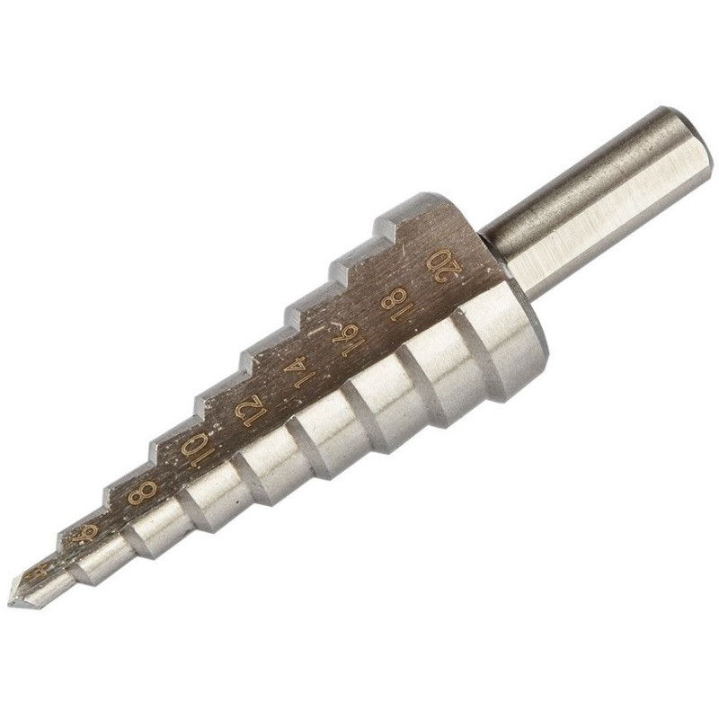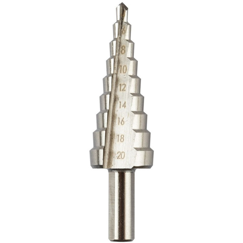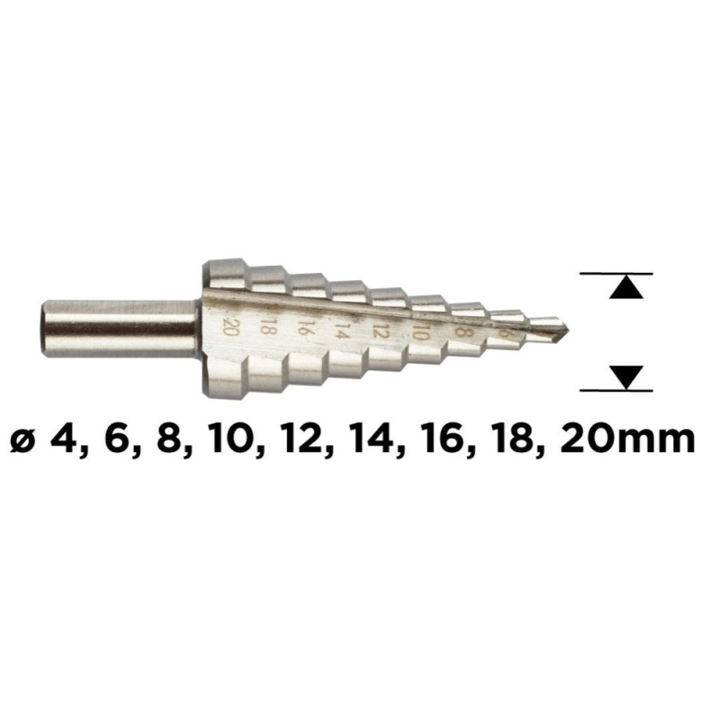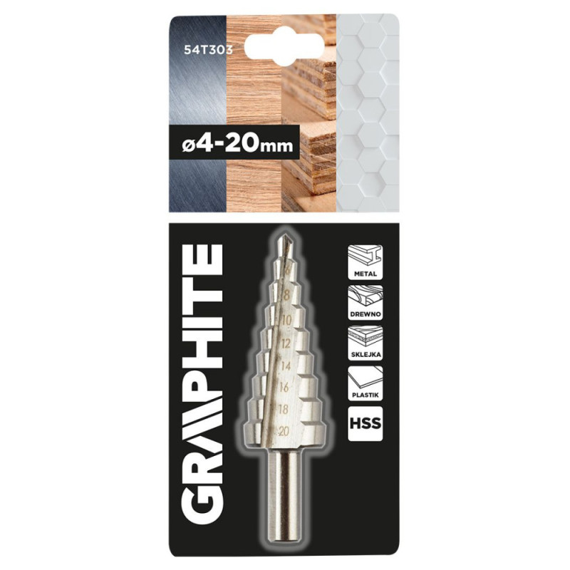 The GRAPHITE HSS Step Drill 4×20 mm 54T303 is designed for drilling holes in thin metal, plastic and other sheet materials. Its stepped cone shape allows drilling multiple hole diameters with one bit. Made from high-speed steel (HSS) for durability and long service life. A practical choice for workshop and repair tasks.