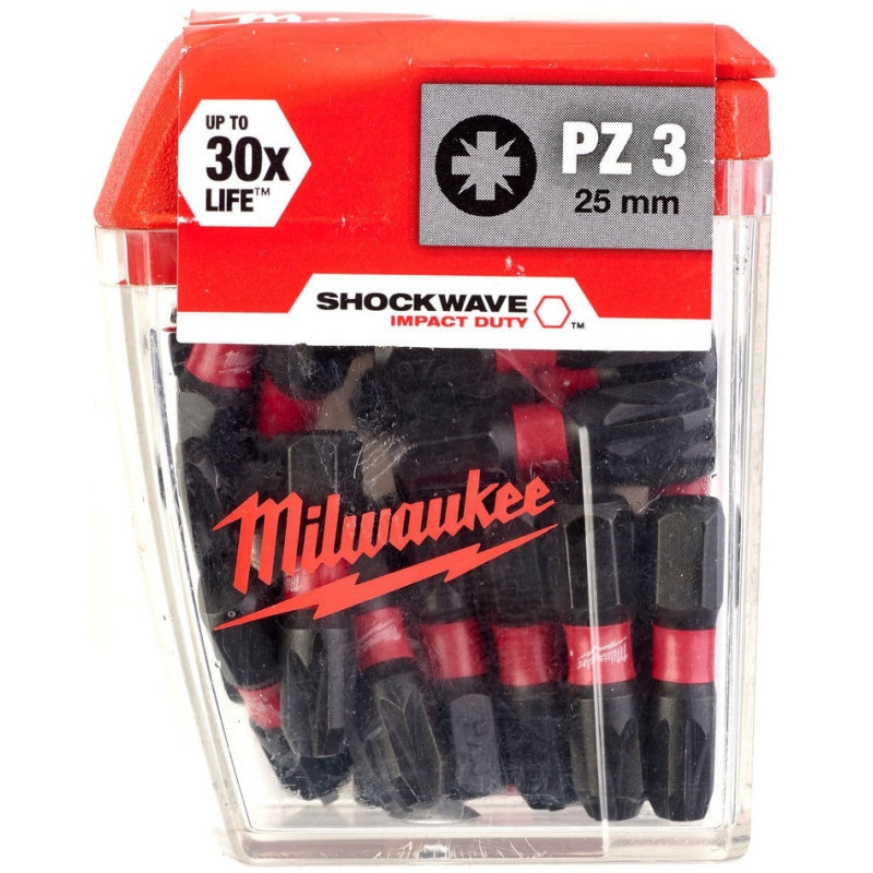 Milwaukee Shockwave PZ3 × 25 mm bits (4932430869) — bulk 25-piece set of impact-rated Pozidriv #3 bits in a storage case. Forged from S2 steel with Shockzone™ flex zone for up to 50× longer life under heavy impact. Laser-hardened Wear Guard Tip™ ensures perfect hold on large screws with zero cam-out. 1/4" hex shank locks securely. The most popular size for decking, cladding, framing, and roofing work.