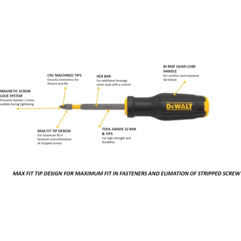 The DeWALT screwdriver set is a reliable solution for everyday work with common SL and PH fasteners. MAX FIT tips improve screw engagement and help reduce slipping under load. S2 steel shafts and ergonomic handles provide durability and user comfort during intensive use.