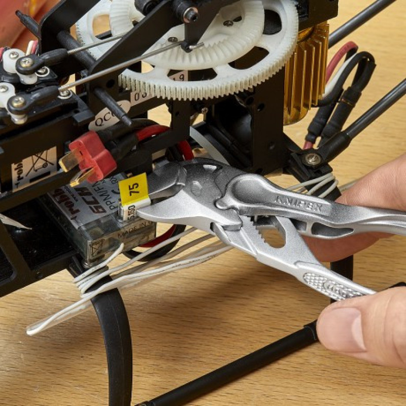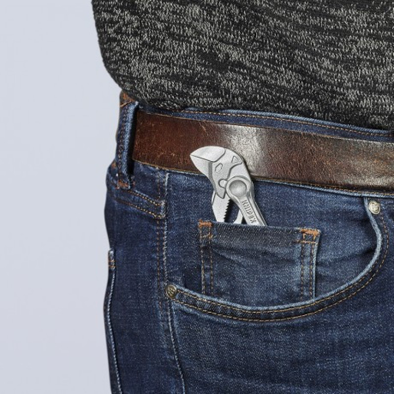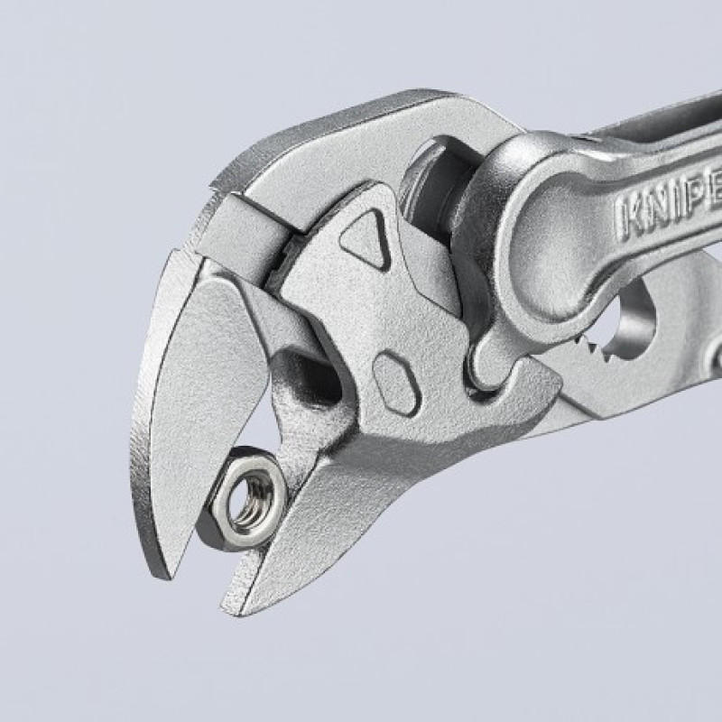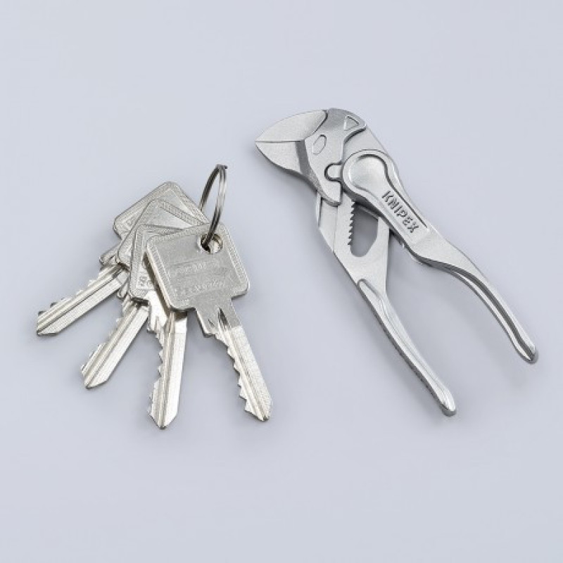 KNIPEX 86 04 100 Pliers Wrench XS is the smallest model in the series at 100 mm long with smooth jaws. It replaces wrenches up to 21 mm (3/4 inch) with 10 push-button adjustment positions. Smooth parallel jaws grip without marking chrome or soft surfaces. Forged from chrome vanadium electric steel with chrome-plated finish. Weight is only 70 g.