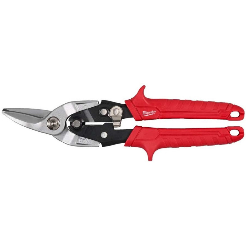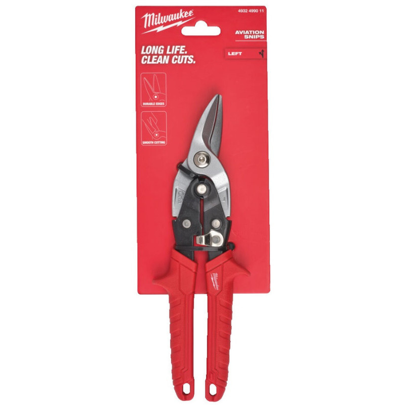 Milwaukee left-hand metal shears (4932499011) — professional tool 251 mm long with red handles for left-side cutting of sheet metal, stainless steel and aluminum. Forged steel blades with laser/induction-hardened edges and chrome plating deliver clean cuts without burrs on galvanized and painted surfaces. Serrated edges prevent slipping, while lever hinge with torsion spring reduces effort and auto-opens jaws. Ergonomic bi-material handles with non-slip coating and metal lock ease use in gloves. At 0.43 kg, the tool suits daily tasks in ventilation, roofing or general sheet metal work.