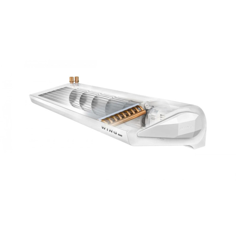 The Wing W200 air curtain provides a strong thermal barrier that prevents heat loss and blocks cold drafts from entering indoor spaces. Its dual-row copper-aluminum heat exchanger delivers efficient, even heating performance. The Wing W200 combines elegance, energy efficiency, and powerful performance in one device.