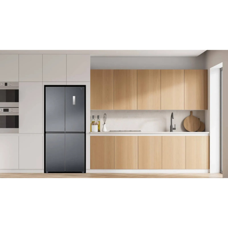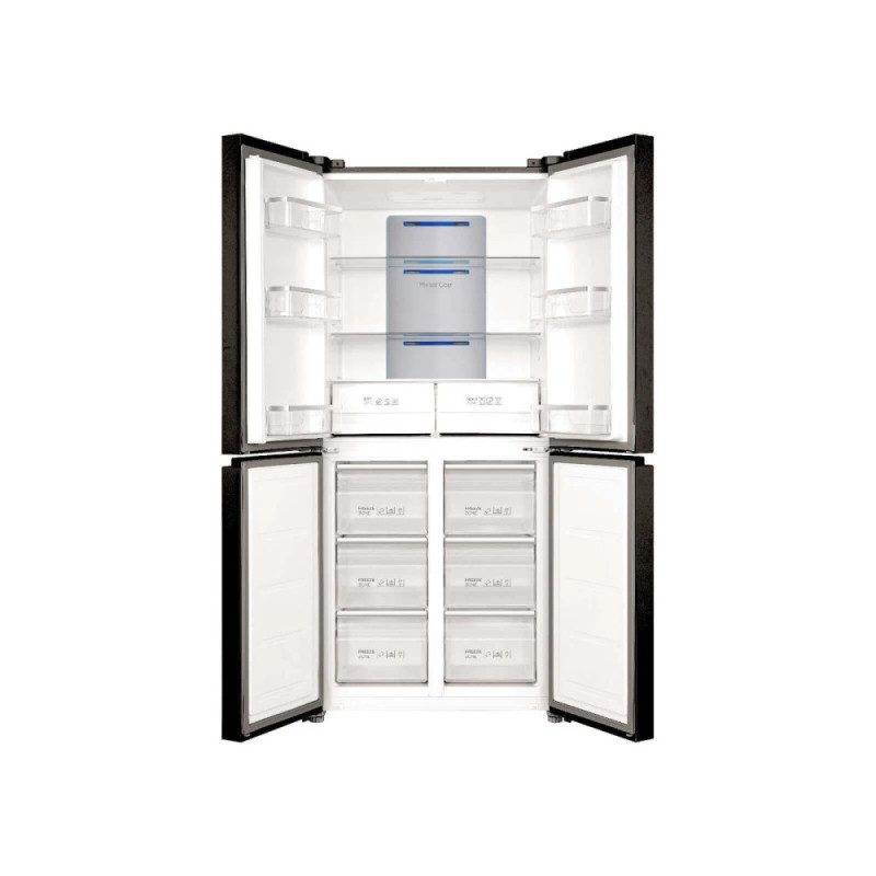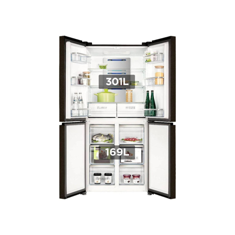 A 470L refrigerator (301L fridge, 169L freezer) with an inverter compressor for energy efficiency, No Frost technology to prevent icing, and multi-airflow cooling for even temperature distribution. Humidity-controlled zones ensure longer freshness for fruits and vegetables.