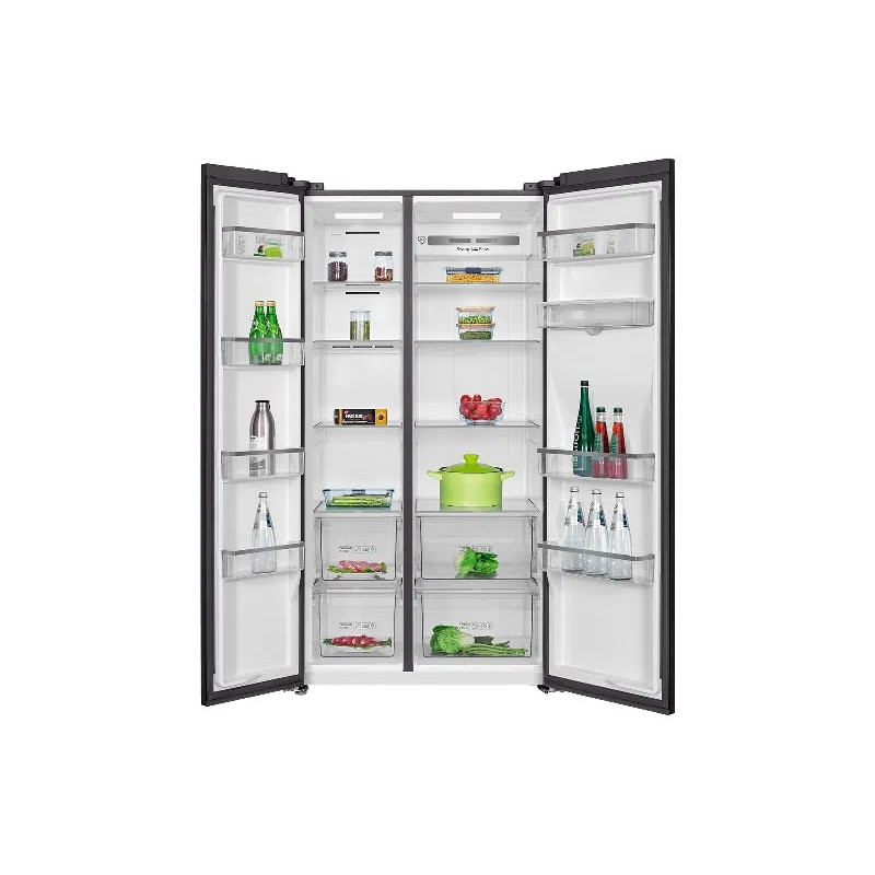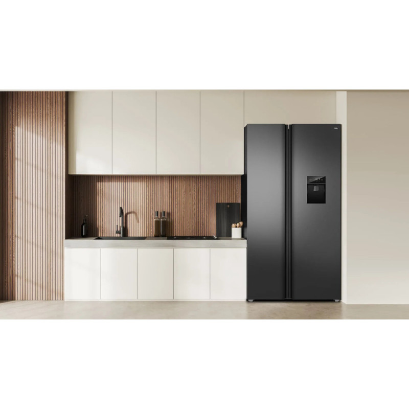 The modern TCL Side-by-Side refrigerator offers a generous 631-liter capacity for convenient food storage. Equipped with an inverter compressor, it ensures energy efficiency, quiet operation, and precise temperature control. The No Frost technology with multi-airflow prevents ice build-up, while the AAT antibacterial system keeps food fresh for longer. Featuring 4 vegetable drawers, durable glass shelves, and a built-in water dispenser, this refrigerator is designed for convenience.