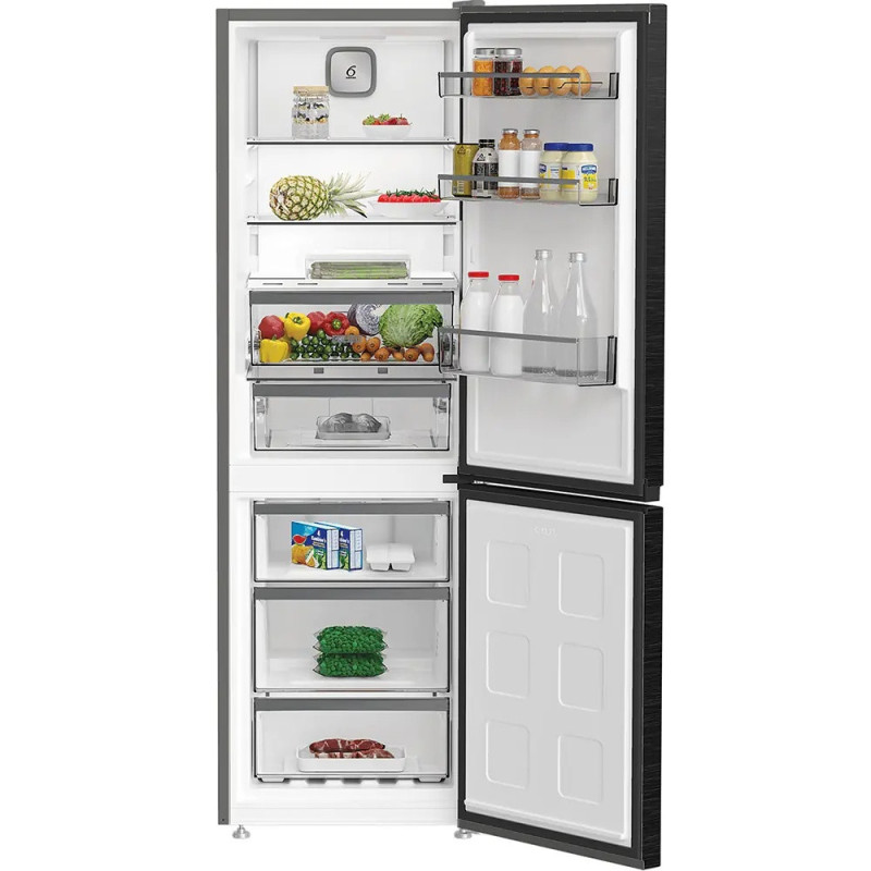 The Whirlpool WHK26363XBR5E refrigerator features a bottom freezer design with a total usable capacity of 316 liters. Dual No Frost technology ensures consistent cooling without ice formation. An inverter compressor supports quiet and stable operation. A dedicated fresh zone helps maintain optimal conditions for delicate foods. The electronic display allows easy temperature control.