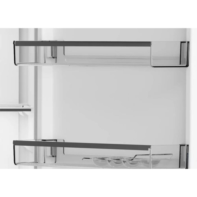 The Whirlpool WHK26402XP4E refrigerator, 203.5 cm tall with a total volume of 355 L and No Frost in both compartments, maintains stable temperatures without manual defrosting. The 249 L fridge with a zero-degree zone and bottle shelf and the 104 L freezer with a 6 kg/day freezing capacity support long-term food storage. Energy class A++ reduces annual electricity costs compared to less efficient classes. Electronic controls with an LED display, independent temperature adjustment, Holiday mode and an open-door alarm provide convenient daily management.