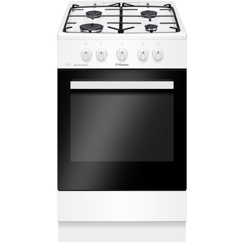 Hansa FCGW510009H is a compact 50×60 cm gas cooker with 70 L gas oven, fully gas-powered (gas on gas), white. Features flame failure safety device on all burners and oven, ignition in knobs, mechanical controls, 4 gas burners (2.8 + 1.8 + 1.8 + 1 kW), enamelled surface, one flat baking tray and wire shelf. Oven with manual cleaning, halogen lighting, 1 heating function (static gas heating), temperature up to 250 °C, energy class A. Storage drawer, removable door with 2 glasses, gas hose and power cord with plug included. Reliable budget model for small kitchen or cottage, easy to use and maintain.