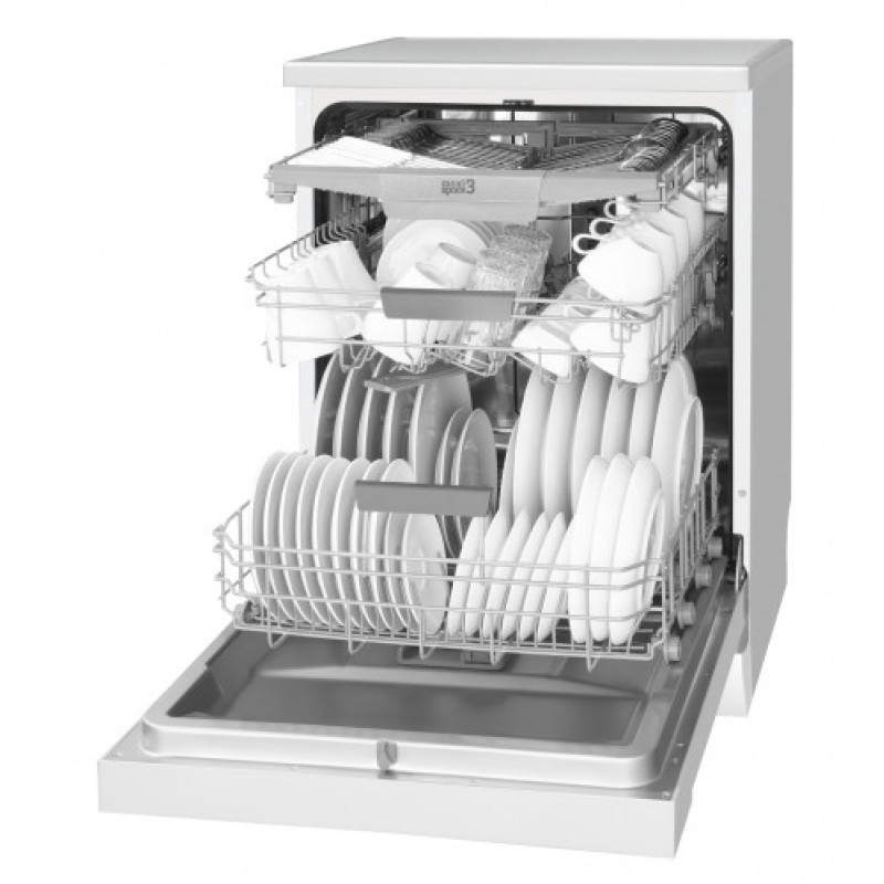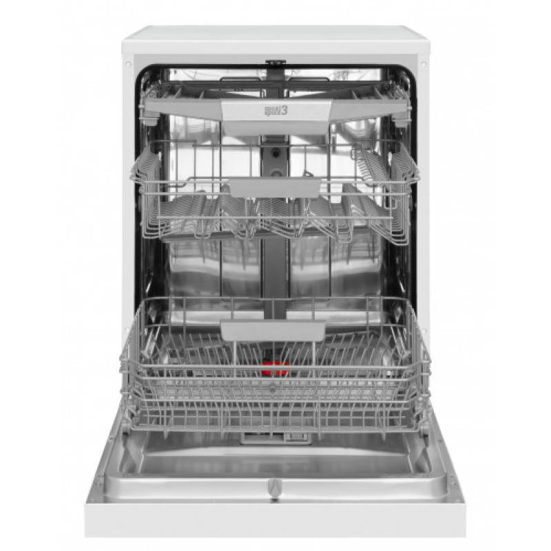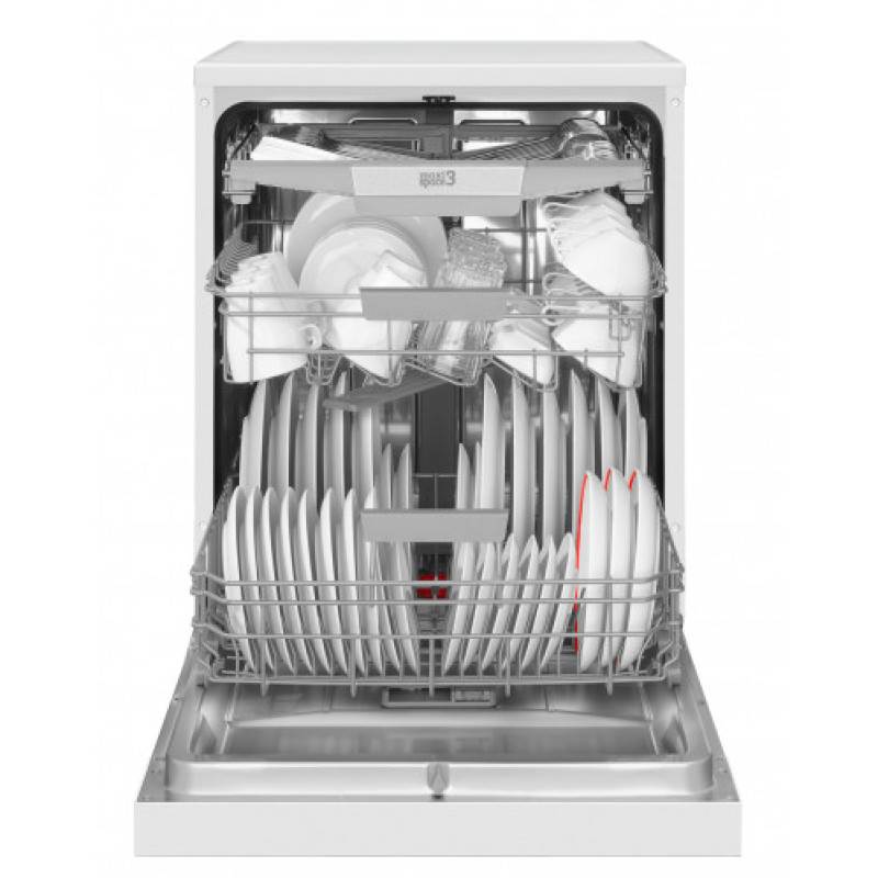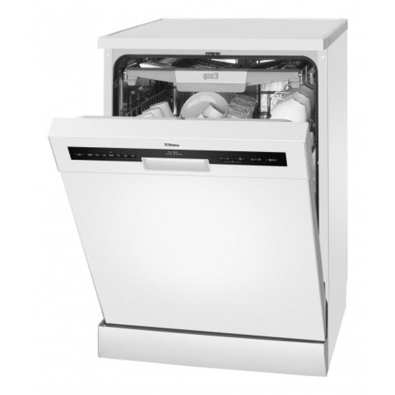 The Hansa ZWM627WH is a freestanding dishwasher with a 14-place setting capacity and A+++ energy efficiency class. It features low water consumption (10 litres per cycle) and quiet operation at 44 dB. Automatic door opening after the cycle and the Aquastop system ensure convenient and safe use.