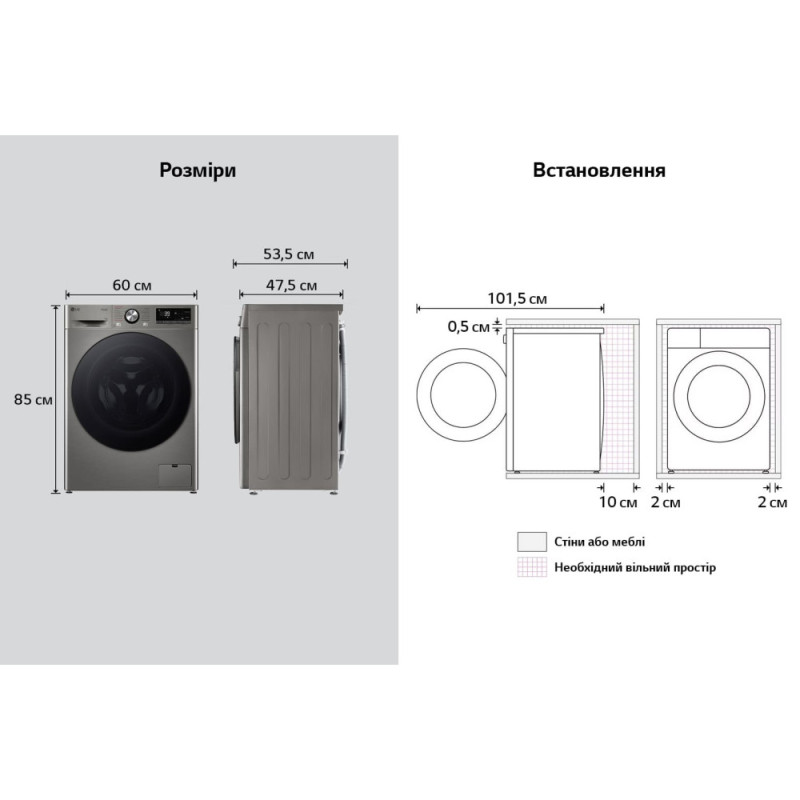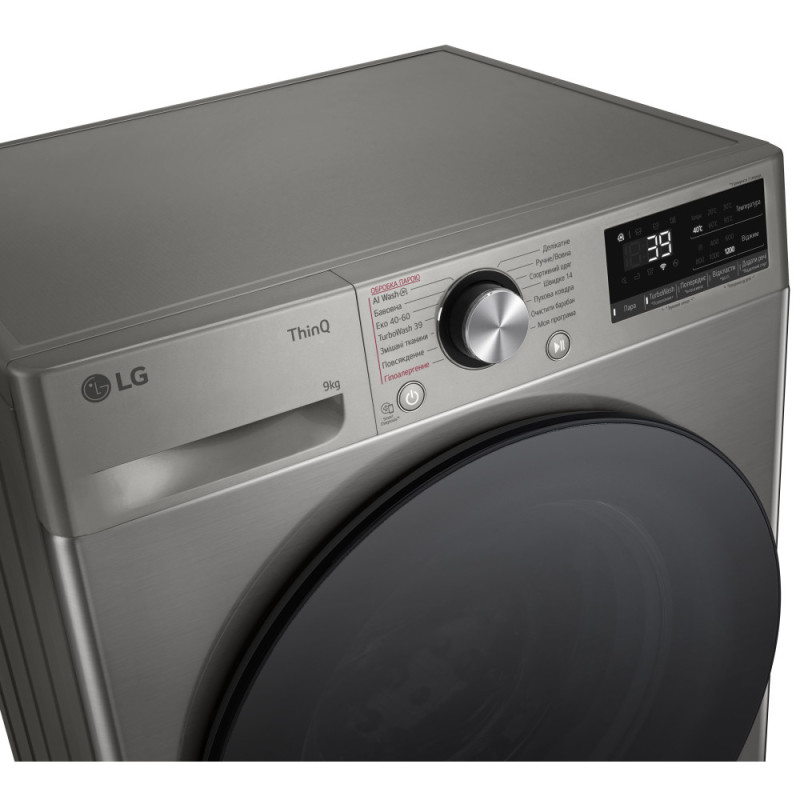 Features:Smart Diagnosis, TurboWash, AI DD™ fabric characteristics determination technology, LG ThinQ™ smart functions (Wi-Fi), 6 Motion technology, Remaining residual time indication, 'Vibration reduction system, Childproof control panel lock, washing cycle stage indicator, indication of selected washing program parameters, door open indication, indication of errors in operation, delay in the end of the washing cycle (3-19 hours), automatic restart with saving previous settings, Steam function, Operation completion indication, door opening: right, Increased size of the app switcher, Delay End mode indication, Indication of the "Child Lock" mode, indication of the "Remote start" mode, Download additional apps via the LG ThinQ™ app over Wi-Fi