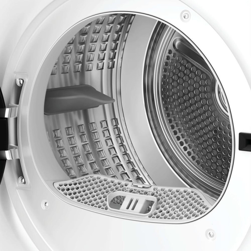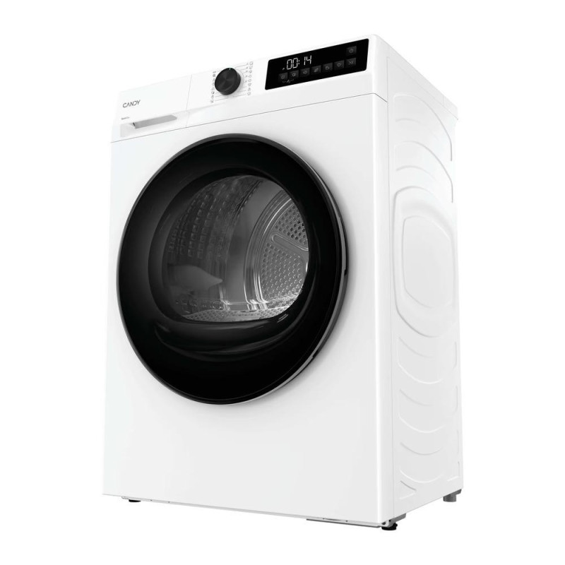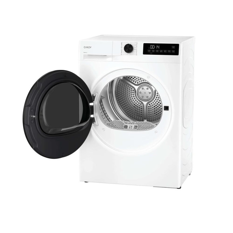The Candy GDS7N2B-S heat pump tumble dryer holds 7 kg of laundry and falls into energy efficiency class D. Its inverter motor and reverse drum rotation promote even drying with fewer creases. Sixteen programmes cover synthetics, wool, jeans, shirts, delicates and quick 30–45 minute cycles, while a moisture sensor automatically detects when items are ready.