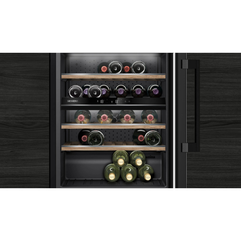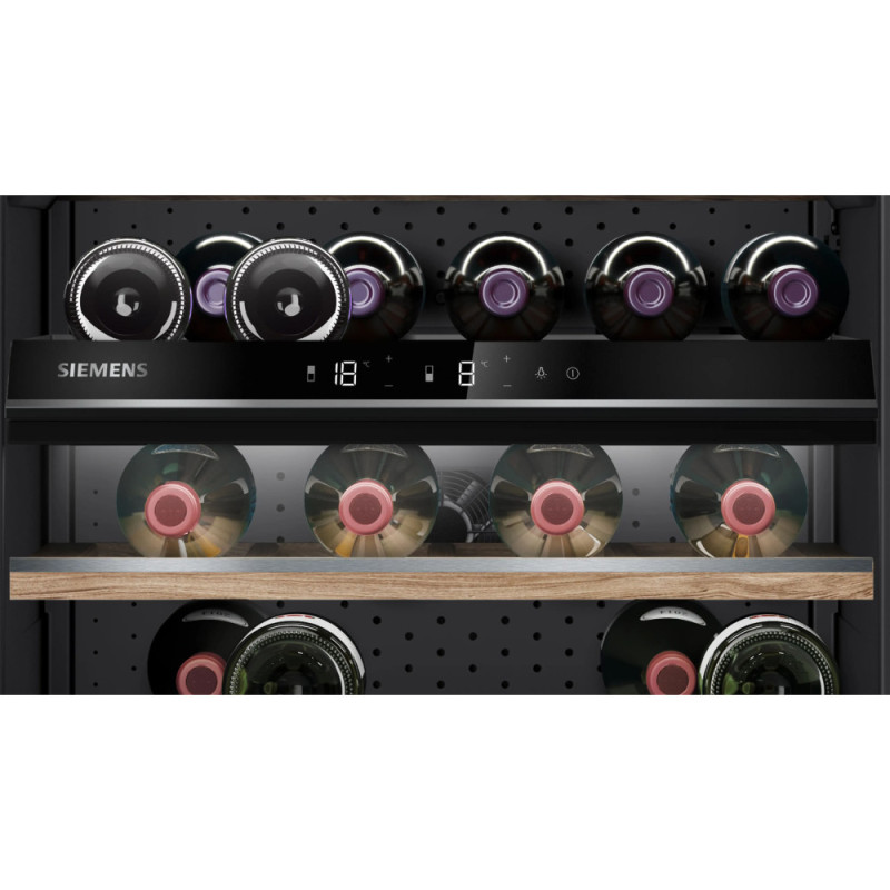 The Siemens wine refrigerator is designed to store wines in two independent temperature zones. The model is equipped with oak shelves with metal elements, glass doors with UV protection, and LED lighting with a presentation mode. It can store up to 44 bottles. Each temperature zone can be adjusted within a range of 5 °C to 20 °C.