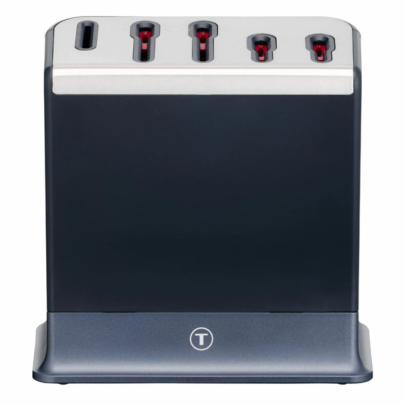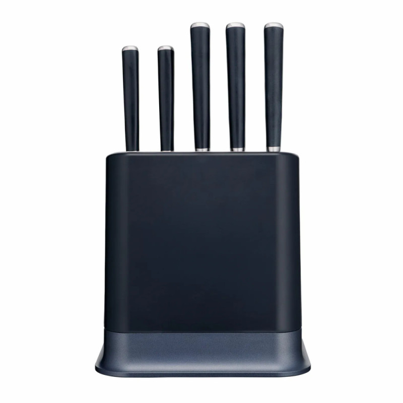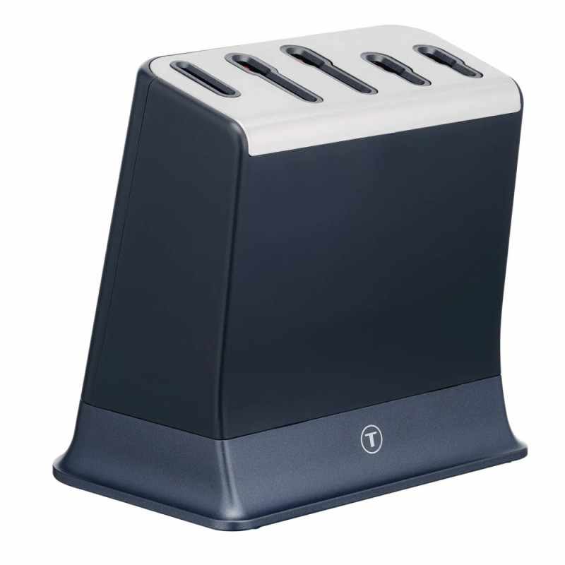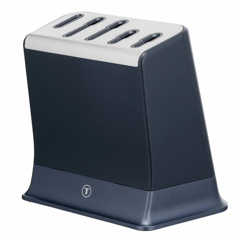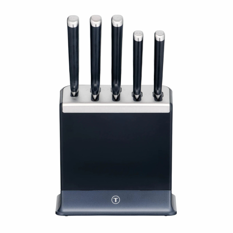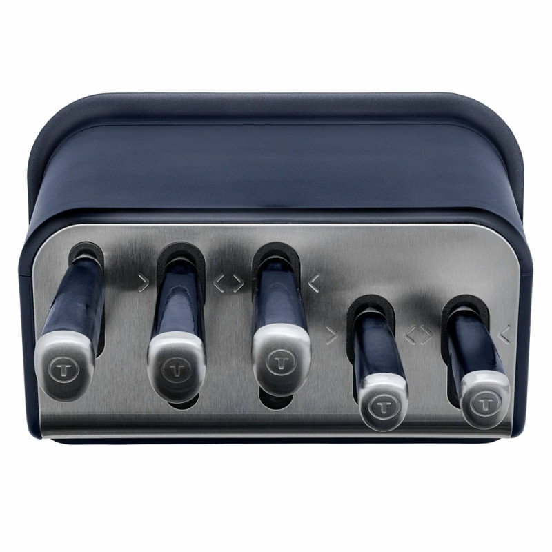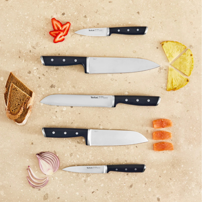 The Tefal Ever Sharp Pro knife set consists of 5 kitchen knives and a block with a built-in automatic sharpening system. The blades are made of German X50Cr15MoV stainless steel to maintain sharpness, and the ceramic elements inside the block sharpen the cutting edge at the correct angle when the knife is removed and returned to its place. Ergonomic handles with finger rests and a balanced design ensure comfortable and controlled work in the kitchen.