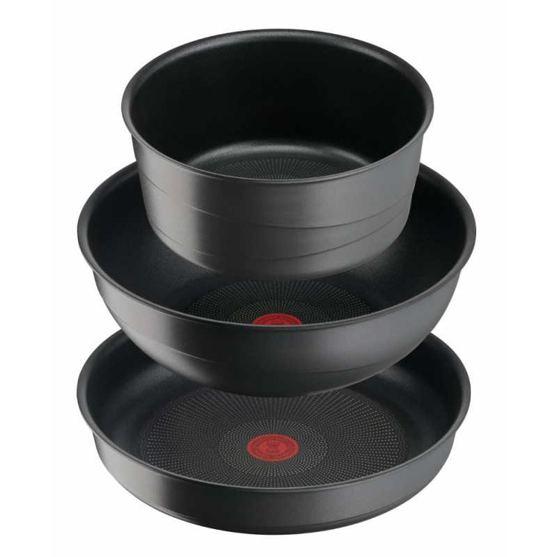 The Tefal Ingenio Inspiration cast aluminum cookware set consists of a 26 cm frying pan, a 20 cm saucepan, a 26 cm wok, two lids, and a removable Ingenio handle. The design allows you to cook on the stove, use the cookware in the oven, and put it in the refrigerator. The Titanium 3X non-stick coating simplifies cooking and cleaning, while the Thermo-Signal™ indicator helps control the heating temperature.