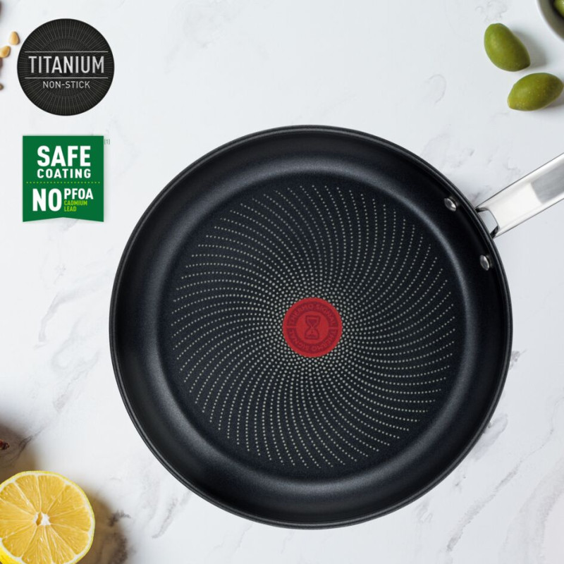 The Tefal Intuition range of frying pans is the best choice for everyday cooking with delicious and healthy results. Thanks to the high-quality materials and advanced technology, they will achieve excellent cooking results every time, and they are guaranteed to be long-lasting and easy to clean. Tefal Intuition frying pans are suitable for all types of cookers, including induction cookers, making them a versatile solution for any kitchen. The use of stainless steel ensures the durability and reliability of the products, and the Titanium non-stick coating makes cooking an easy and enjoyable task. 28 cm frying pan: Thanks to its large size, you can cook for a large family. The best choice for stewing and frying.