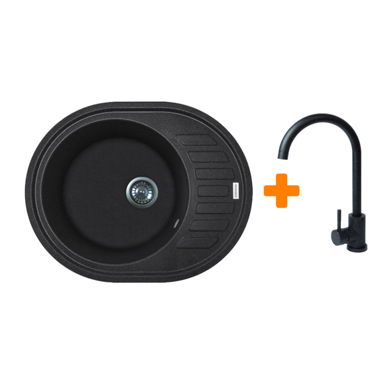 Adamant Kitchen sink Ovum, artificial stone, oval, with drainboard, 615х495х200mm, bowl - 1, over-mounted, black + mixer (1824296910403)