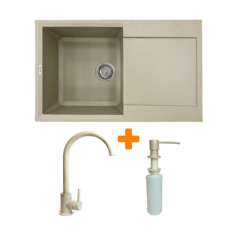 Adamant Kitchen set Horizon, artificial stone, rectang., with drainboard, 780х495х230mm, bowl - 1, over-mounted, Sahara + mixer and dispenser (182496901502)
