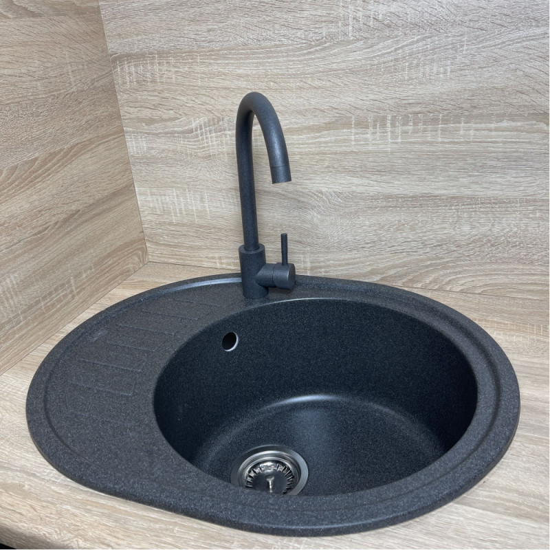 Adamant Kitchen set Ovum, artificial stone, oval, with drainboard, 615х495х200mm, bowl - 1, over-mounted, graphite + mixer and dispenser (1824296900413)