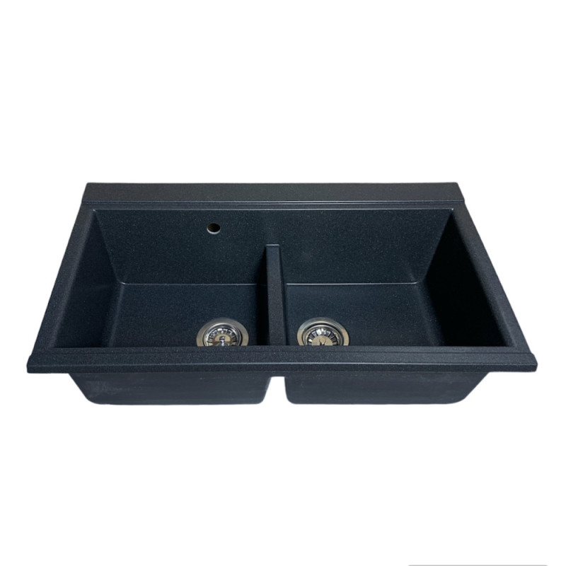 Adamant Kitchen set Similar, artificial stone, rectang., no drainboard, 885x505x230mm, bowl - 2, over-mounted, graphite + mixer + dispenser + glass rinser + colander (4824296106513)