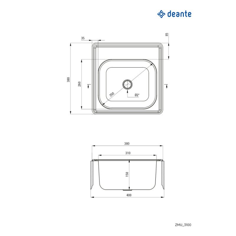 Deante Kitchen sink Techno, stainless steel, square, without wing, 380x390x150mm, bowl - 1, overhead, stainless (ZMU_3100)